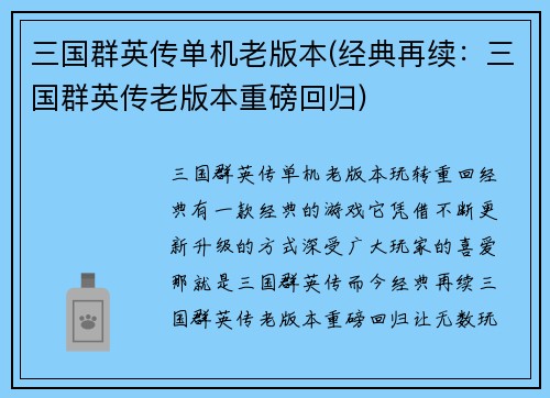 三国群英传单机老版本(经典再续:三国群英传老版本重磅回归)