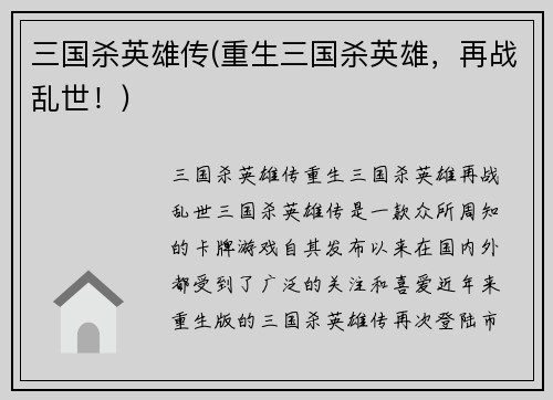 三国杀英雄传(重生三国杀英雄,再战乱世!)
